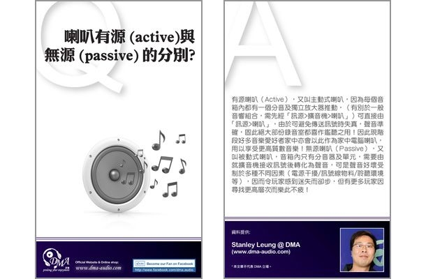 有源喇叭(Active),又叫主動式喇叭,因為每個音箱內都有一個分音及獨立放大器推動,(有別於一般音響組合,需先經「訊源>擴音機>喇叭」)可直接由「訊源>喇叭」,由於可避免傳送訊號時失真,聲音準確,固此絕大部份錄音室都喜作鑑聽之用!因此現階段好多音樂愛好者家中亦會以此作為家中電腦喇叭,用以享受更高質數音樂!無源喇叭(Passive),又叫被動式喇叭,音箱內只有分音器及單元,需要由就擴音機接收訊號後轉化為聲音,可是聲音好壞受制於多種不同因素(電源干擾/訊號線物料/聆聽環境等),因而令玩家感到迷失而卻步,但有更多玩家因尋找更高層次而樂此不疲!