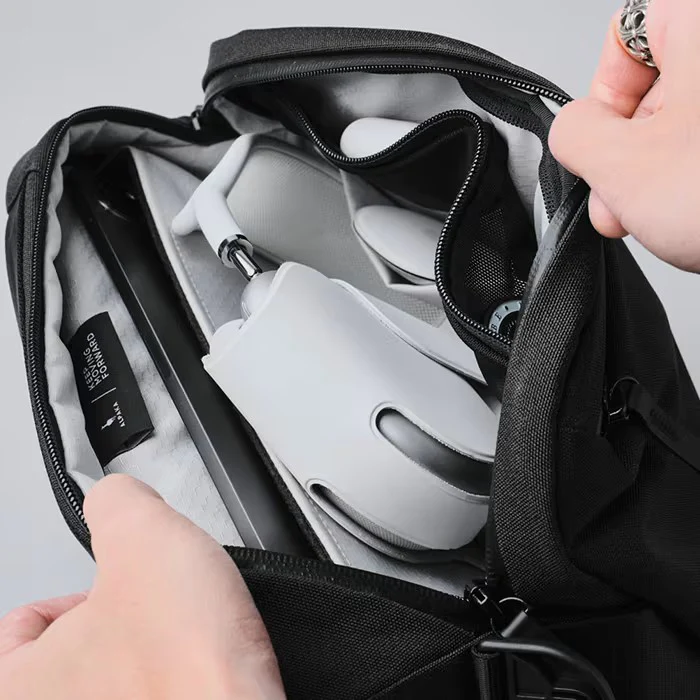 3 個靜音拉鍊隔層可整理您的必需品,內襯 300D 冷灰色蜂巢狀防撕裂尼龍襯裡。