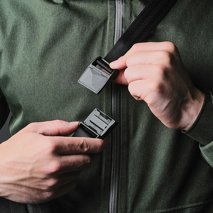 Go Sling Nano 上的快速釋放磁性扣環可確保您在移動時牢固鎖定您的身體,並在需要時輕鬆拆卸。