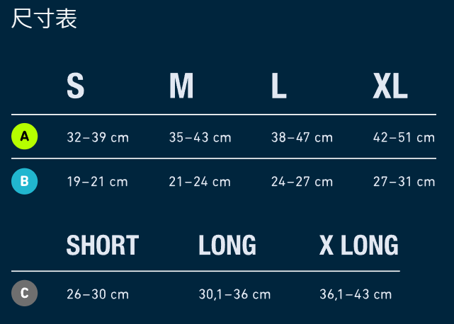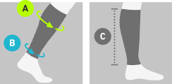 A) 測量小腿最大點的周長。 B) 測量腳踝最窄處的周長。 C) 測量小腿長度:從膝蓋以下兩根手指開始測量,一直測量到腳踝最窄處。
