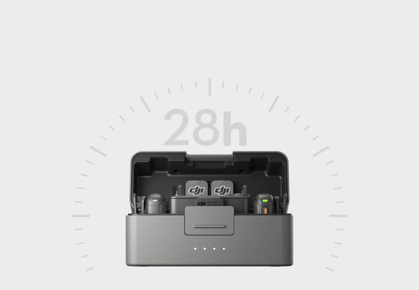 發射器續航 8 小時[12],接收器 10 小時[12],充電盒支援 28 小時總續航[13];充 5 分鐘可用 2 小時[14],快速回歸創作狀態;支援多種智慧省電功能,還可邊充邊用[15]。