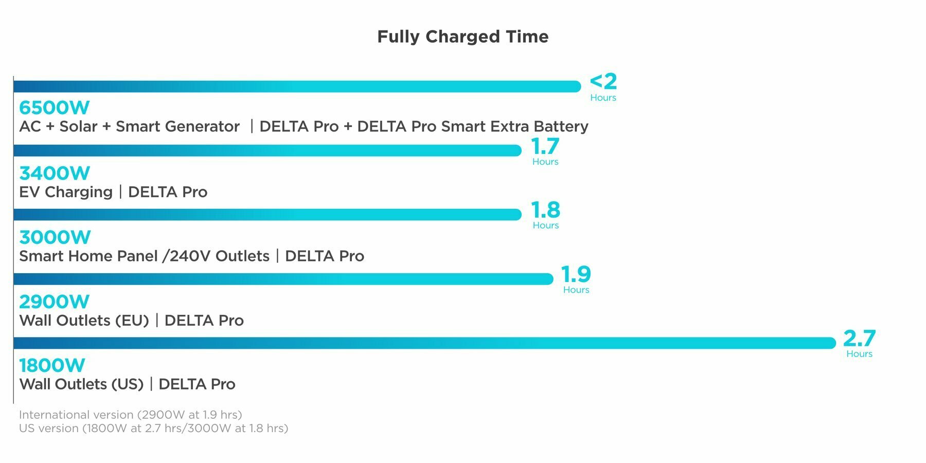 EcoFlow 的 X-Stream 充電技術不僅速度快而且安全。 電池管理系統可確保安全性和提高使用壽命,同時您可以在 1.9 小時內使用標準交流電源插座為 DELTA Pro 充滿電。