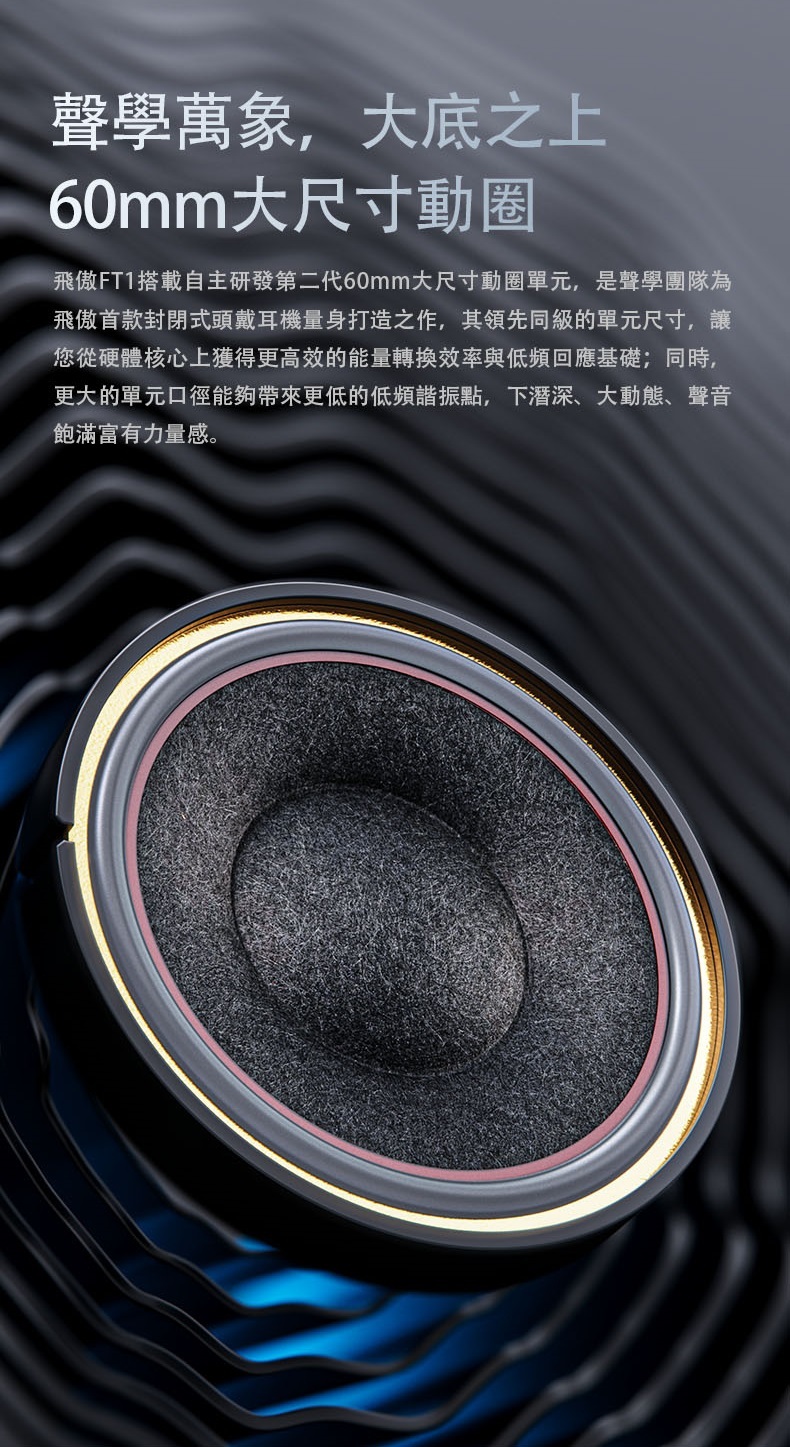 FiiO FT1搭載自主研發第二代60mm大尺寸動圈單元,是聲學團隊為FiiO 首款封閉式頭戴耳機量身打造之作,其領先同級的單元尺寸,讓您從硬體核心上獲得更高效的能量轉換效率與低頻回應基礎;同時,更大的單元口徑能夠帶來更低的低頻諧振點,下潛深、大動態、聲音飽滿富有力量感。