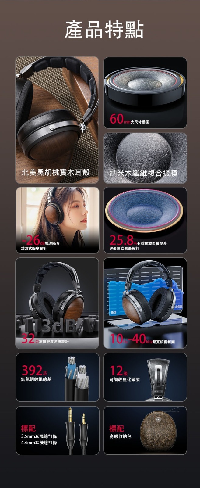 北美黑胡桃實木耳殼 | 60mm大尺寸動圈 | 納米木纖維複合振膜 | W形獨立懸邊設計 | 封閉式聲學設計 | U形聲阻尼管 | 錐形折流板 | 32Ω高靈敏度易推設計 | 標配高級收納包 | 標配3.5mm+4.4mm耳機線