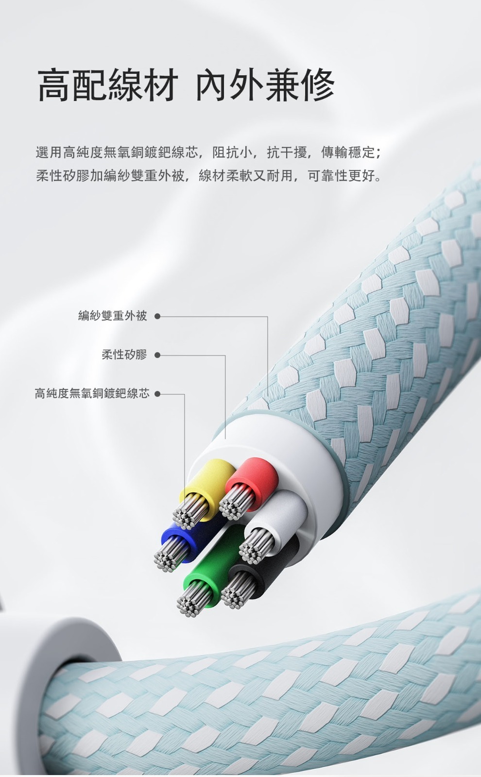 選用高純度無氧銅鍍鈀線芯,阻抗小,抗干擾,傳輸穩定;柔性矽膠加編紗雙重外被,線材柔軟又耐用,可靠性更好。