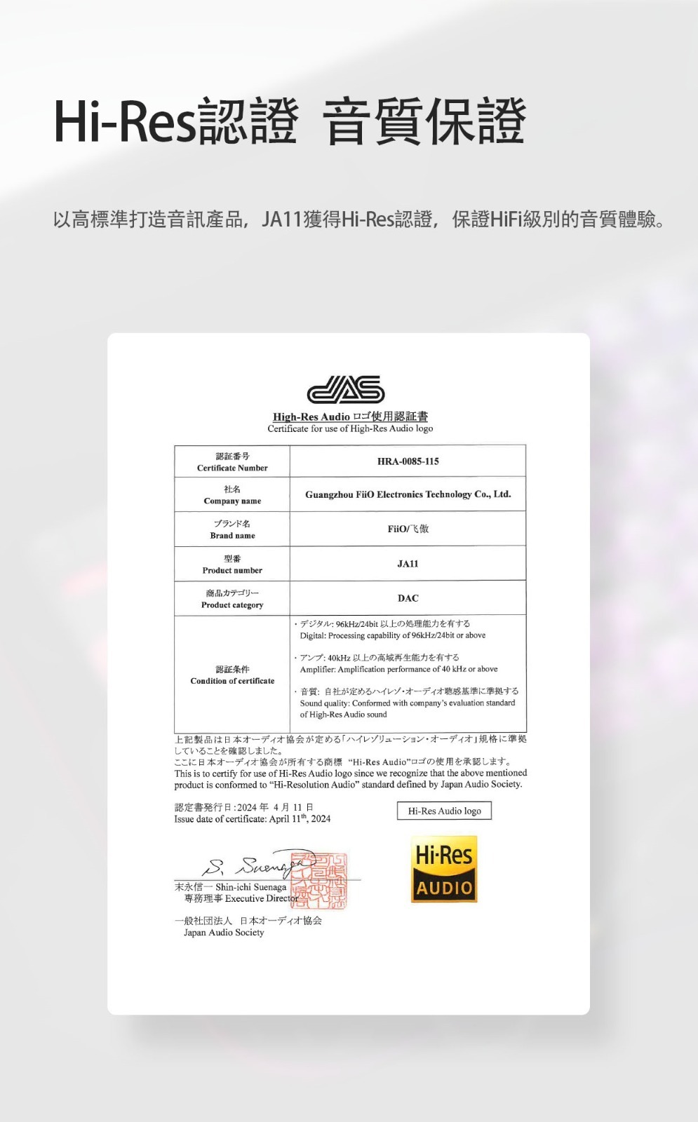 以高標準打造音訊產品,JA11獲得Hi-Res認證,保證HiFi級別的音質體驗。