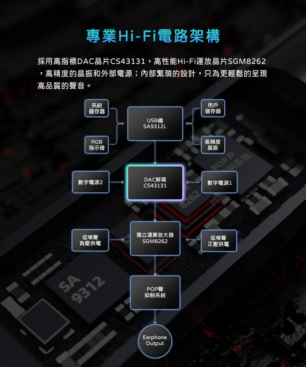 專業Hi-Fi電路架構  |  高指標的DAC晶片CS43131,高性能的Hi-Fi運放晶片SGM8262,高精度的晶振和外部電源;內部繁瑣的設計,只為更輕鬆的呈現高品質的聲音。