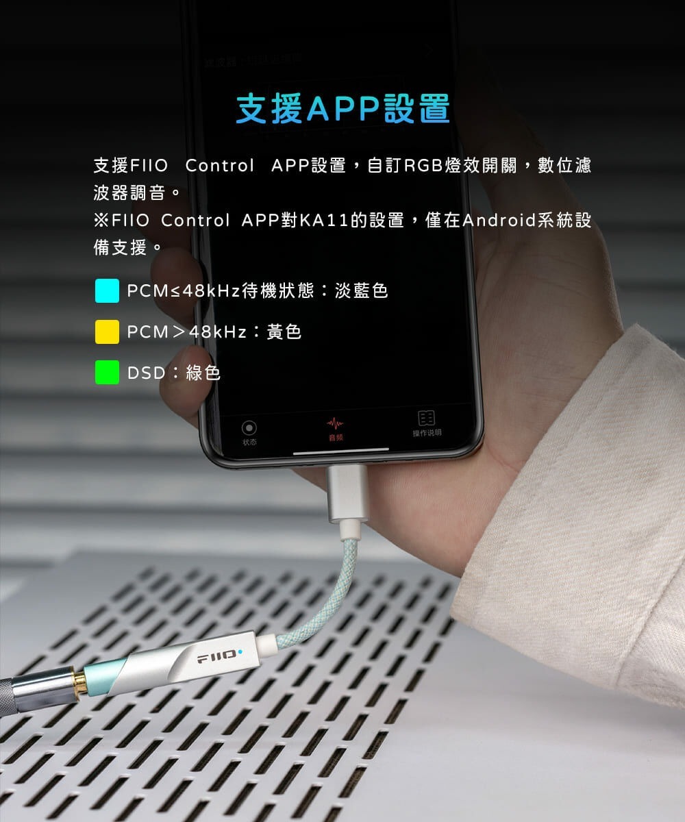 支援APP設置  |  支援FIIO Control APP設置,自訂RGB燈效開關,數位濾波器調音。