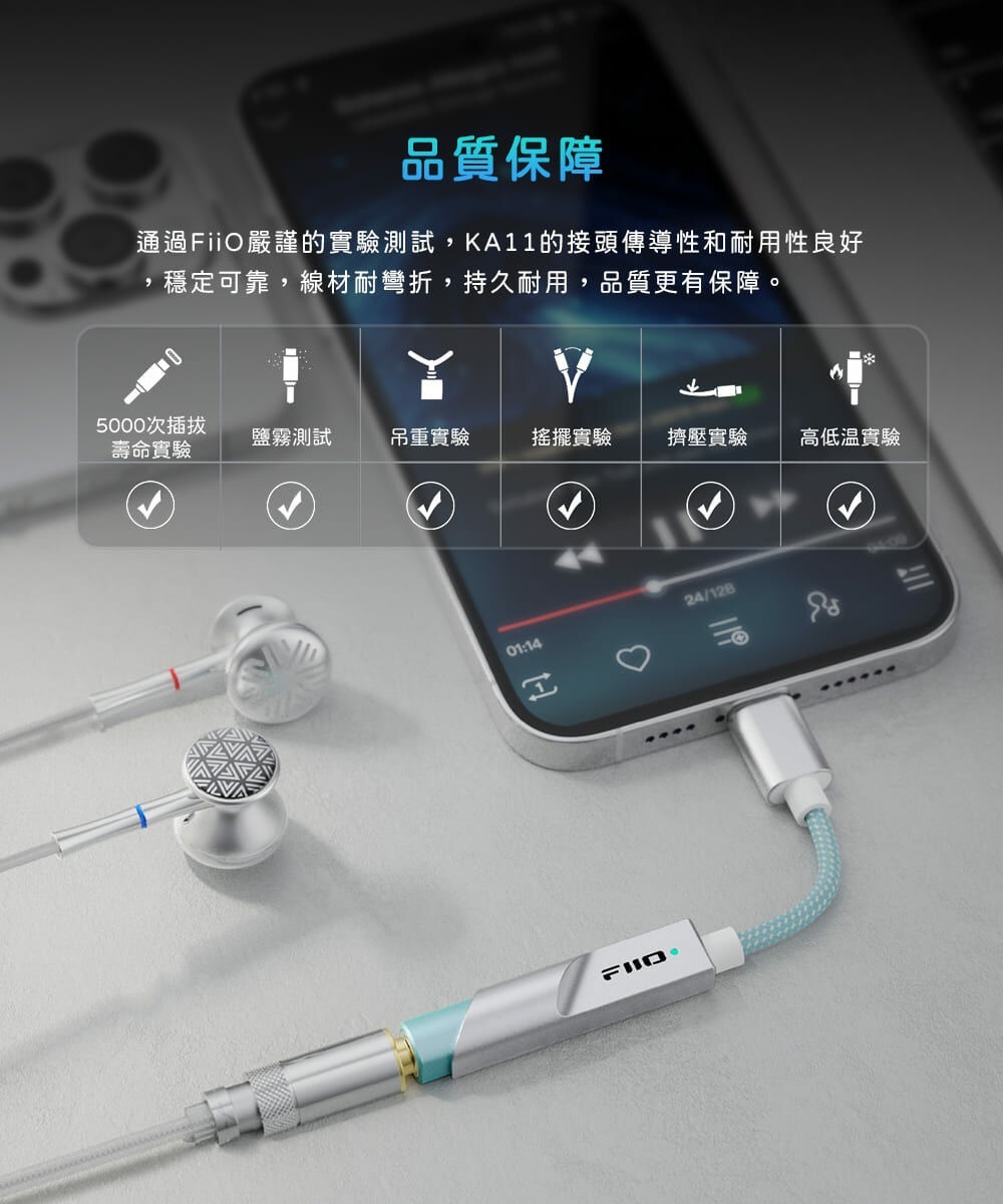 品質保障  |  通過FiiO嚴謹的實驗測試,KA11的接頭傳導性和耐用性良好,穩定可靠,線材耐彎折,持久耐用,品質更有保障。