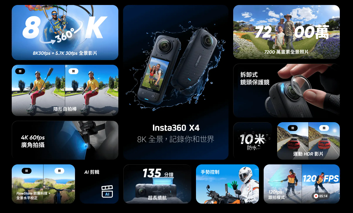 8K 30fps 全景影片 - 我們有史以來最高的解析度,可呈現令人驚嘆的畫面! 另外,還有新的 5.7K 60fps 和 4K 100fps 以及 7200萬畫素照片。