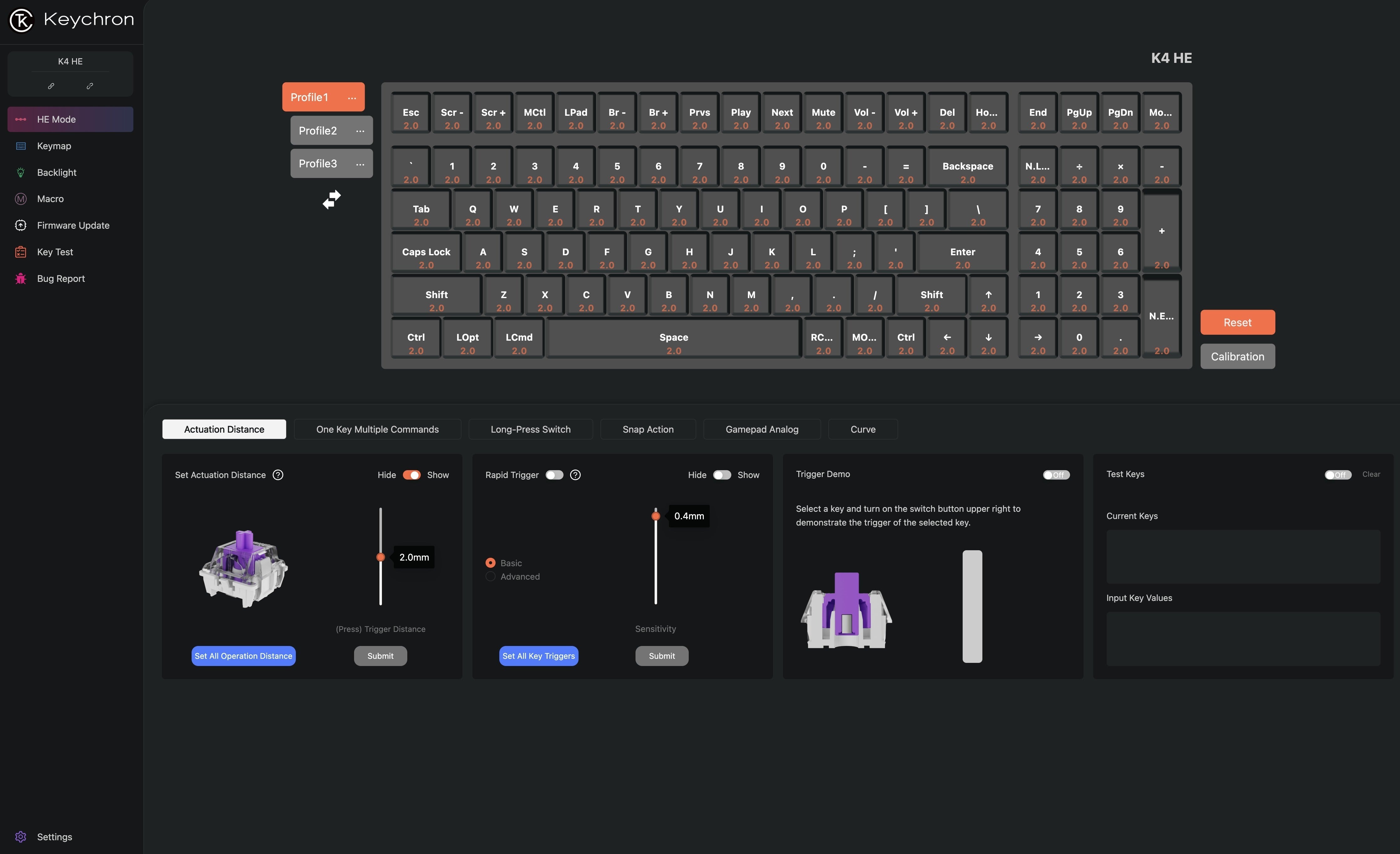 • 體驗 K4 HE 上的模擬模式的強大功能,為您的鍵盤帶來遊戲控制器般的精度。此模式支援可變輸入,而不是通常的開/關訊號,讓您實現更流暢、更動態的控制。