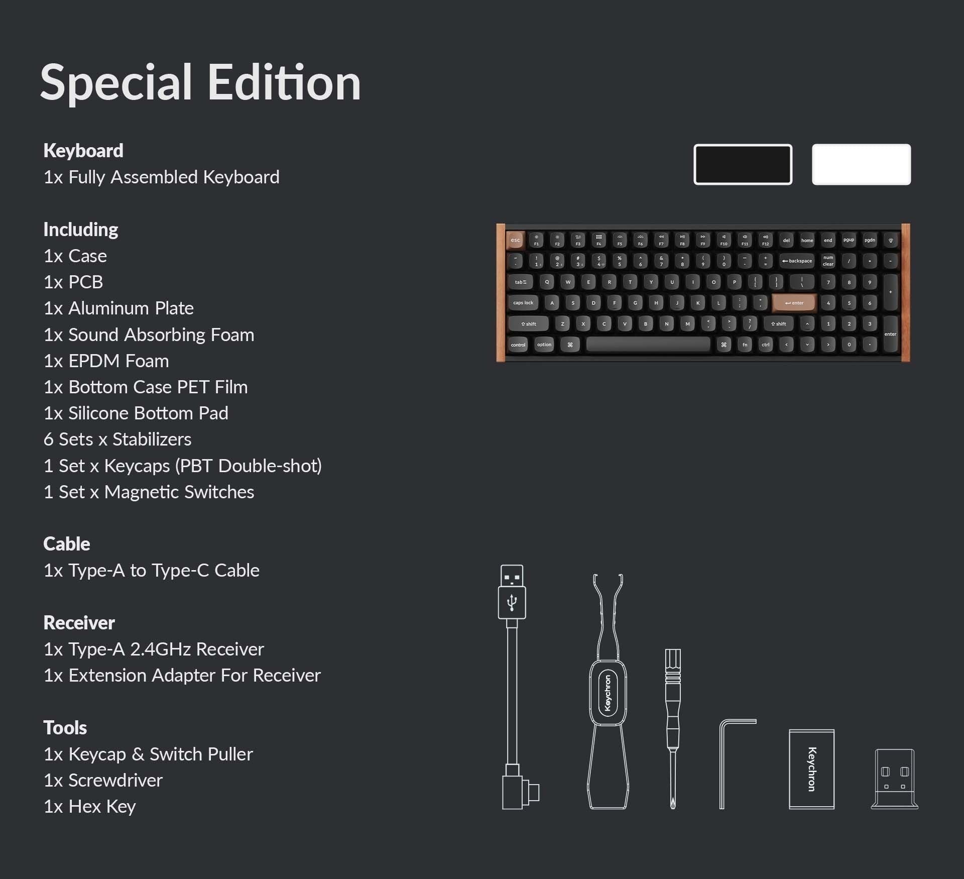 • 特別版提供兩種配色,均帶有天然玫瑰木裝飾——白色版為淺色木材,黑色版為深色木材。兩個版本均採用 OSA 型雙色注塑 PBT 鍵帽和鋁材以及木質框架。
