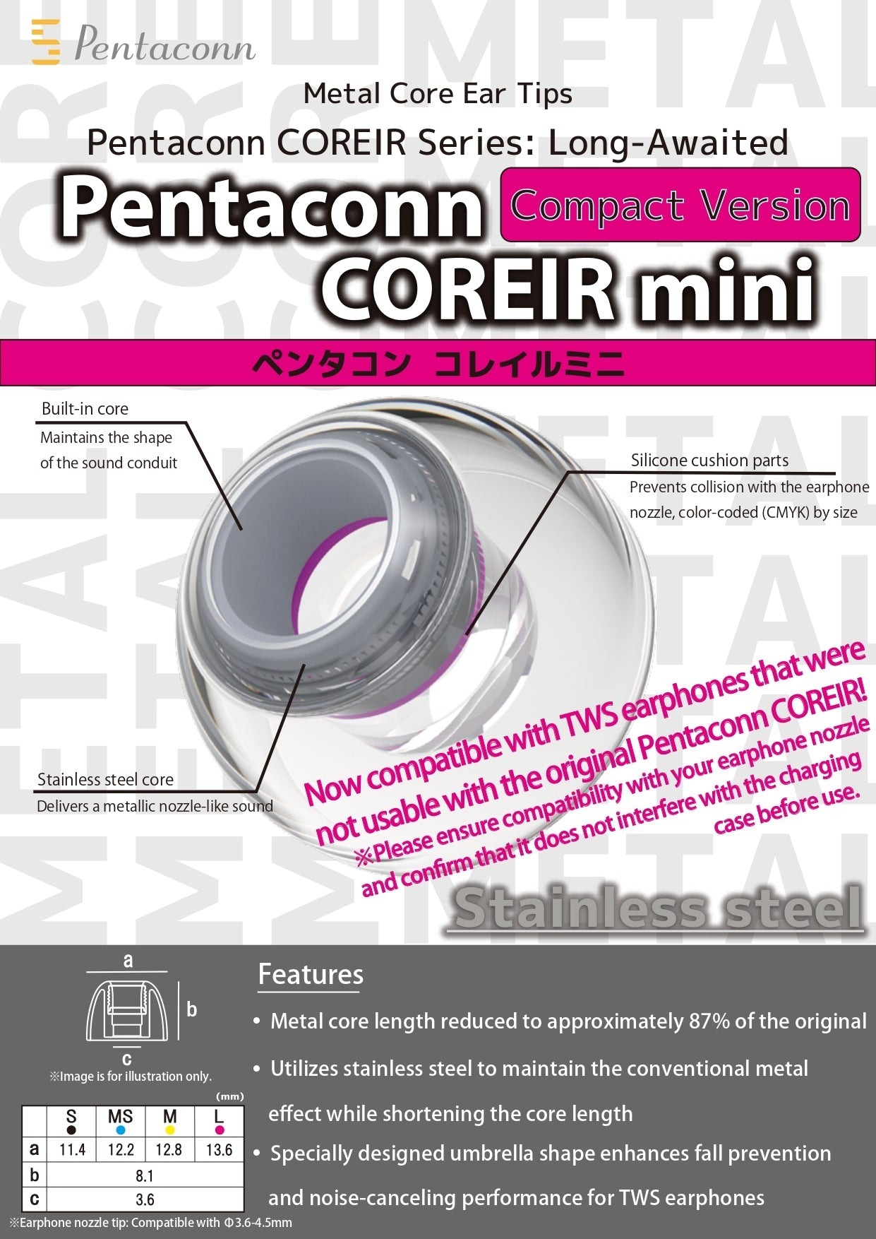新一代 Pentaconn COREIR mini 的金屬芯總長度與傳統型號相比減少了約 87%,與有些短約70%的無線耳機都可使用,不是單純縮短金屬管而已,並用上重新設計的 Pentaconn COREIR,可以讓更多使用真無線耳機的使用者能夠輕鬆使用它。