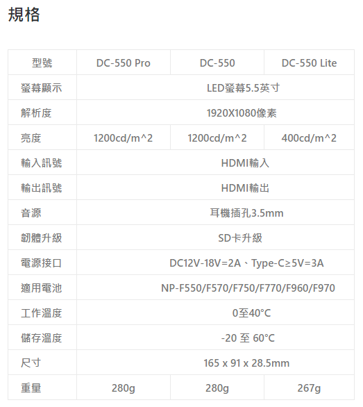 • 【Professional Monitoring Software】:DC-550 series has rich monitoring functions, imports 3D LUT through the SD card, and helps the photographer achieve a variety of creative effects in the post-editing. In addition, it also has a Parade waveform, vector graph, brightness histogram, auxiliary focus, audio column, image flip, false color, etc.