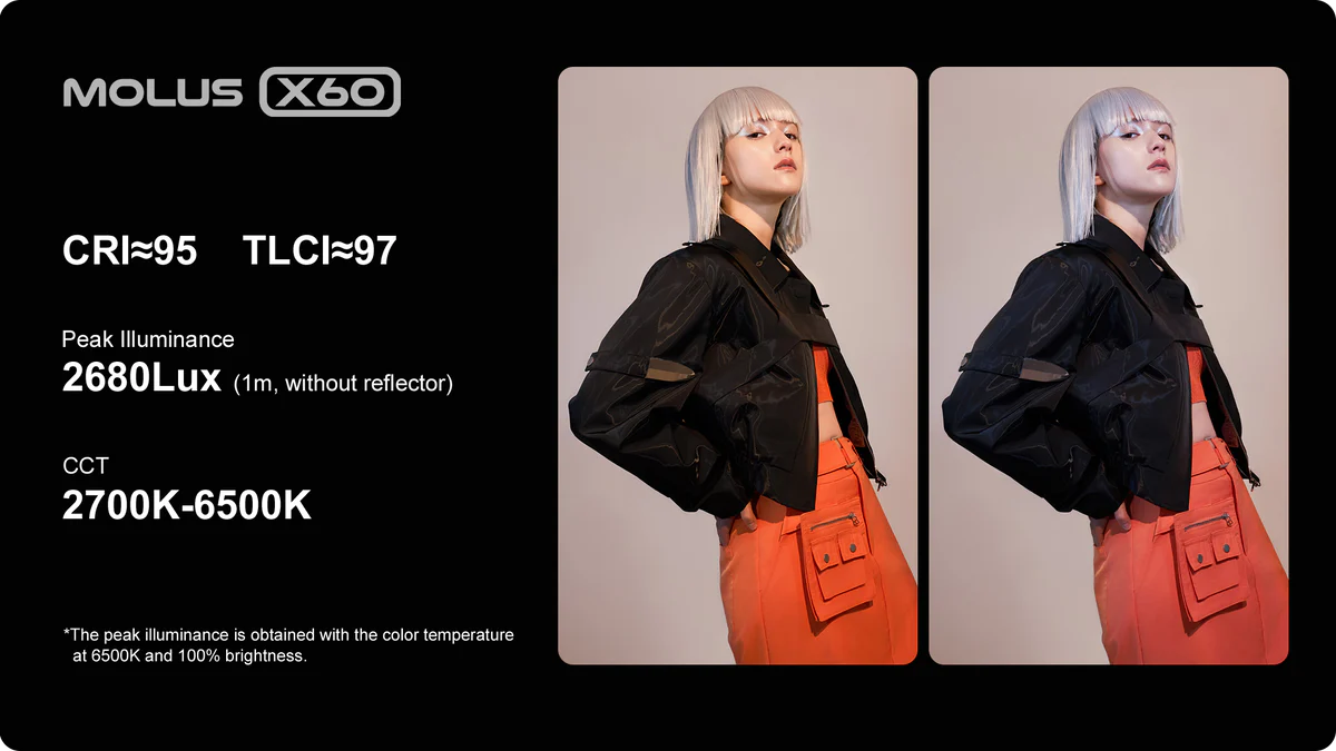 Provide strong and stable 60W lighting performance, accurately restore the true color of objects, calmly cope with diverse shooting needs in complex scenes.