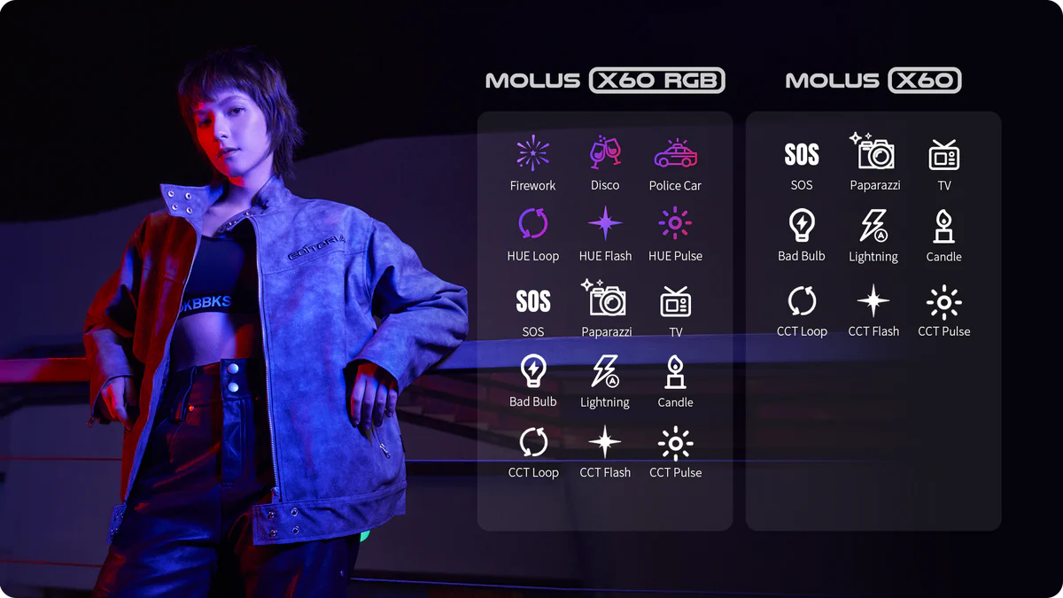 Provide you with creative lighting effects to help you easily set the mood when inspiration strikes. The extra 6 RGB moods unique of the X60-RGB version make your photography even more unique.