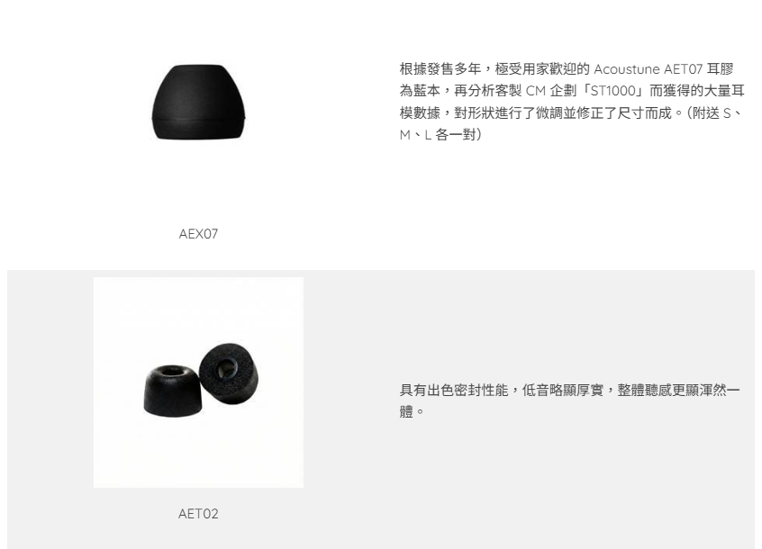 配件:ARX600 耳機線、麂皮便攜盒、AEX07(S / M / L)、AEX50(XS / S / M / L / XL)、AEX70(S / M / L)、AET02(耳棉)